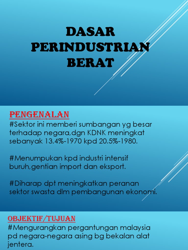 DASAR PERINDUSTRIAN BERAT DI MALAYSIA Latarbelakang Sektor perindustrian memberi sumbangan yang besar kepada ekonomi negara setanding dengan sektor pertanian. Menurut Menteri di Jabatan Perdana Menteri Ekonomi Dato Sri Mustapa Mohamed dasar ini mengandungi 4 teras utama yang. Sumbangan sektor perindustrian dalam KDNK telah meningkat dari 134 pada tahun 1970 kepada 205 dalam tahun 1980 sementara sumbangan sektor pertanian menurun dari 308 kepada 222 dalam tempuh yang sama.